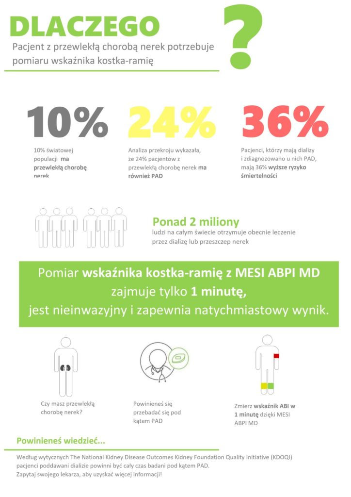 Wróćmy do początku. Dlaczego centra dializ potrzebują urządzenia pomiarowego ABI? Nie tylko dlatego, że nefrologowie powinni być odpowiedzialni za badania przesiewowe i wykrywanie PAD u pacjentów z CKD, ale także dlatego, że pacjenci dializowani powinni być cały czas sprawdzani pod kątem PAD, będąc w trakcie dializy. Jednak fakt, że bardzo ograniczona liczba praktyk nefrologów i jednostek dializ jest przystosowana do wykonywania tych pomiarów, nie pomaga.